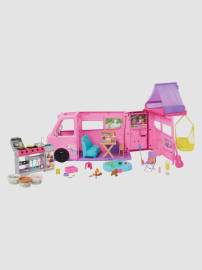 kommer Barbie-dockorna få leva sitt bästa campingliv. Här finns möjligheter att öppna upp husbilen när dockorna anlänt till sitt resmål. Då kan man resa ett tält för två dockor på taket och börja inreda campingplatsen med stolar och grill. Det roliga med detta lekset är att 60 campingtillbehör medföljer.